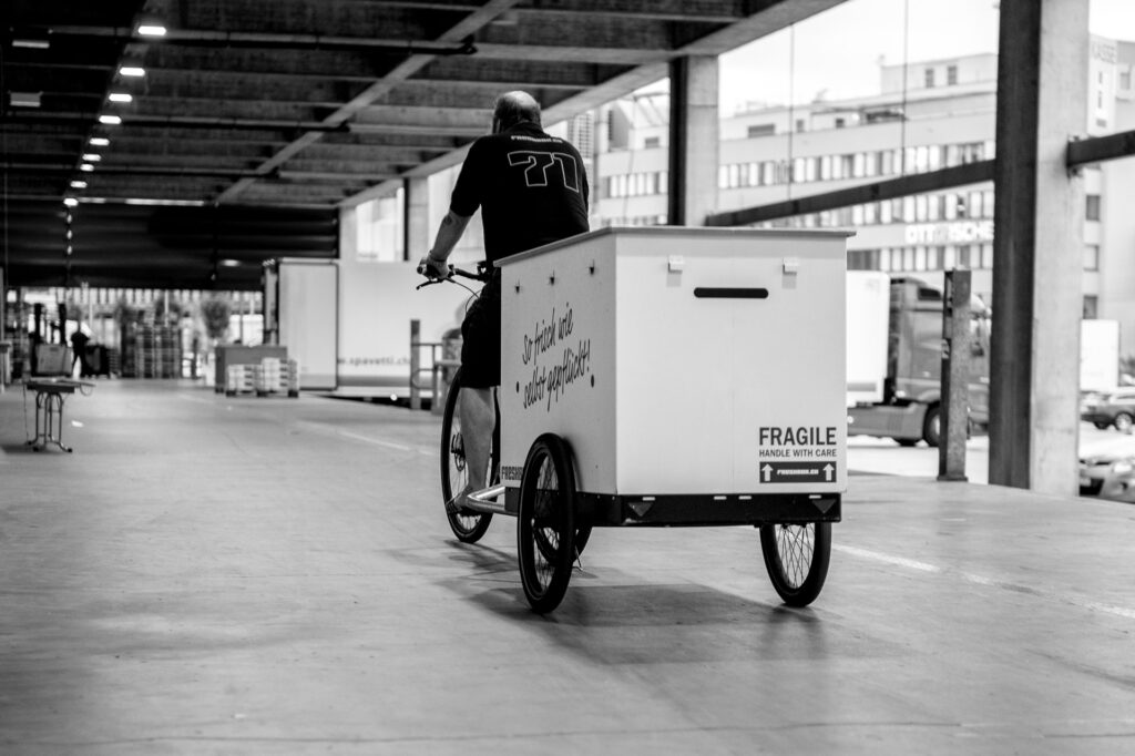 Nebst dem Auto und der Post liefern wir in der Stadt Zürich die Boxen mit dem Freshbox-Velo aus.